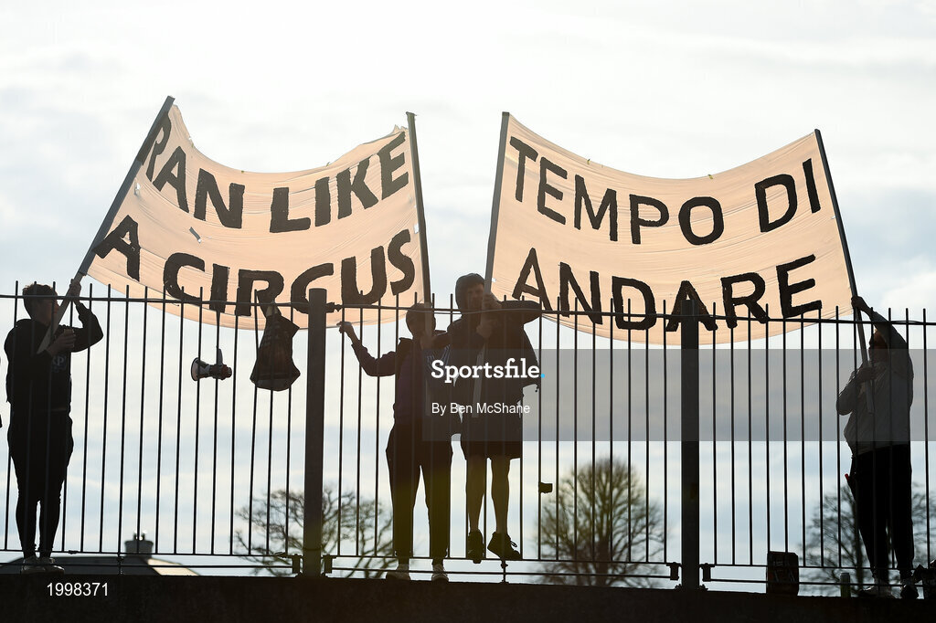 17 April 2021; Dundalk supporters hold a banner outside the ground before the SSE Airtricity League Premier Division match between Dundalk and St Patrick's Athletic at Oriel Park in Dundalk, Louth. Photo by Ben McShane/Sportsfile