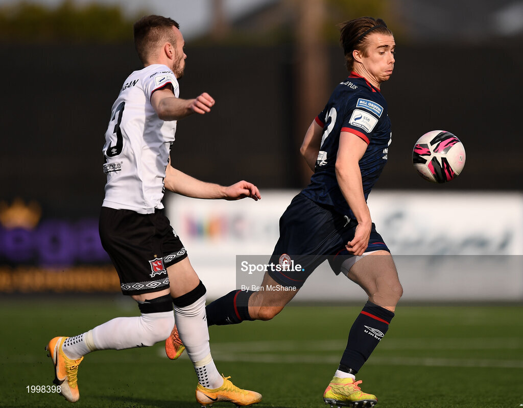17 April 2021; Matty Smith of St Patrick's Athletic in action against Cameron Dummigan of Dundalk during the SSE Airtricity League Premier Division match between Dundalk and St Patrick's Athletic at Oriel Park in Dundalk, Louth. Photo by Ben McShane/Sportsfile