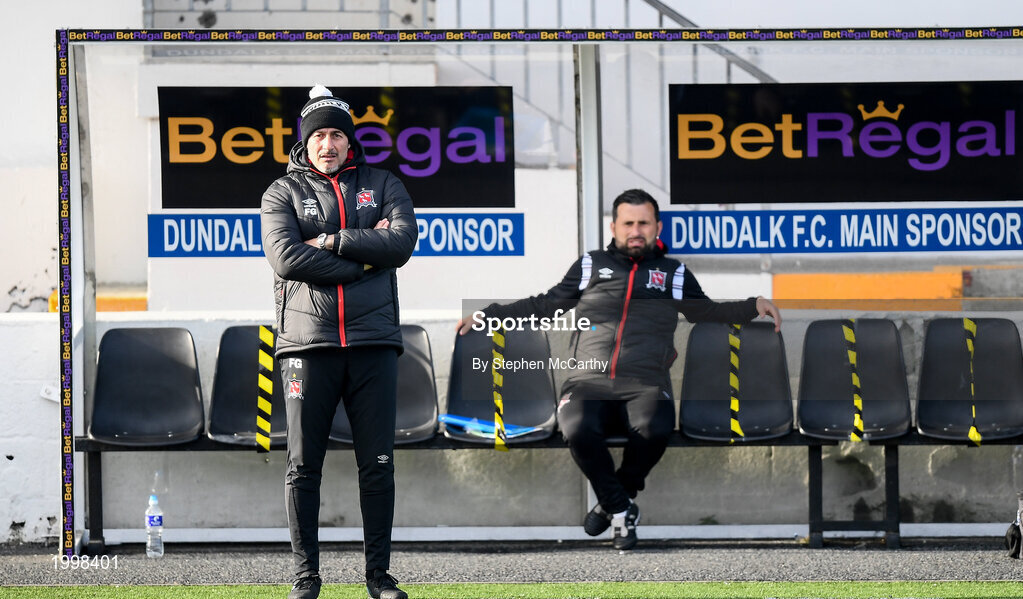 17 April 2021; Dundalk coach Filippo Giovagnoli, left, and Dundalk coach Giuseppi Rossi in the dugout during the SSE Airtricity League Premier Division match between Dundalk and St Patrick's Athletic at Oriel Park in Dundalk, Louth. Photo by Stephen McCarthy/Sportsfile