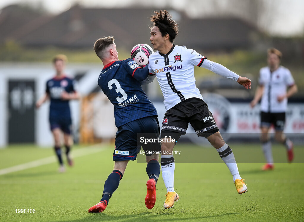 17 April 2021; Ian Bermingham of St Patrick's Athletic in action against Han Jeongwoo of Dundalk during the SSE Airtricity League Premier Division match between Dundalk and St Patrick's Athletic at Oriel Park in Dundalk, Louth. Photo by Stephen McCarthy/Sportsfile