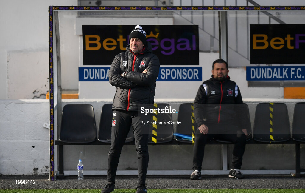 17 April 2021; Dundalk coach Filippo Giovagnoli, left, and Dundalk coach Giuseppi Rossi look on from the dugout during the SSE Airtricity League Premier Division match between Dundalk and St Patrick's Athletic at Oriel Park in Dundalk, Louth. Photo by Stephen McCarthy/Sportsfile