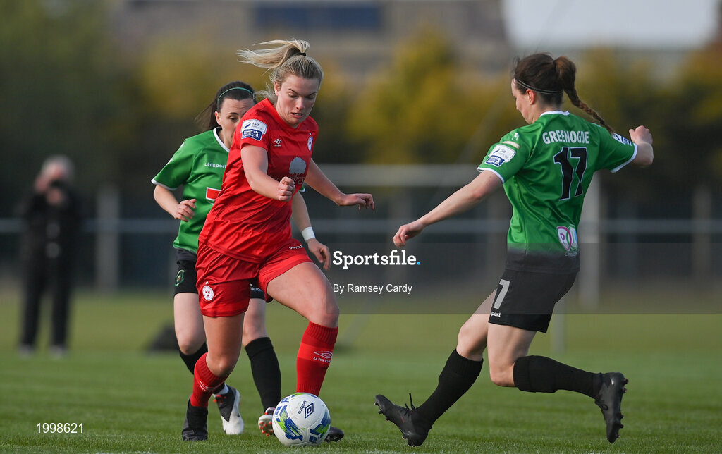 17 April 2021; Saoirse Noonan of Shelbourne in action against Dearbhaile Beirke of Peamount United during the SSE Airtricity Women's National League match between Peamount United and Shelbourne at PLR Park in Greenogue, Dublin. Photo by Ramsey Cardy/Sportsfile