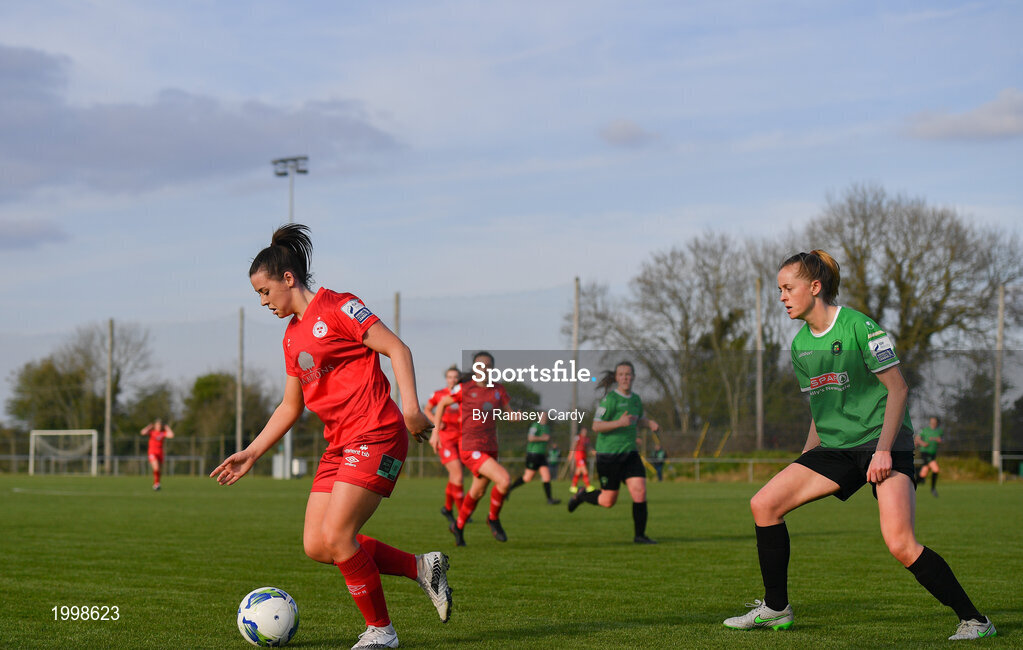 17 April 2021; Emily Whelan of Shelbourne in action against Claire Walsh of Peamount United during the SSE Airtricity Women's National League match between Peamount United and Shelbourne at PLR Park in Greenogue, Dublin. Photo by Ramsey Cardy/Sportsfile