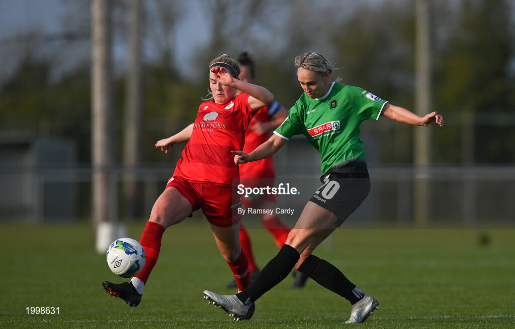 17 April 2021; Stephanie Roche of Peamount United in action against Jessie Stapleton of Shelbourne during the SSE Airtricity Women's National League match between Peamount United and Shelbourne at PLR Park in Greenogue, Dublin. Photo by Ramsey Cardy/Sportsfile