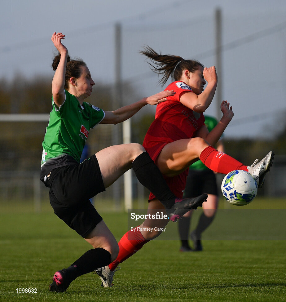 17 April 2021; Karen Duggan of Peamount United in action against Emily Whelan of Shelbourne during the SSE Airtricity Women's National League match between Peamount United and Shelbourne at PLR Park in Greenogue, Dublin. Photo by Ramsey Cardy/Sportsfile