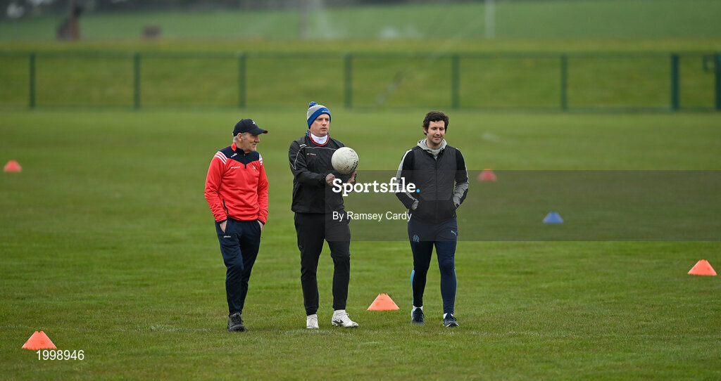 19 April 2021; The Louth management team, from left, manager Mickey Harte, assistant manager Gavin Devlin and coach Niall Sharkey during senior football squad training at the Louth GAA Centre of Excellence in Louth. Following approval from the GAA and the Irish Government, the GAA released its safe return to play protocols, allowing full contact inter-county training at adult level can re-commence from April 19th. Photo by Ramsey Cardy/Sportsfile