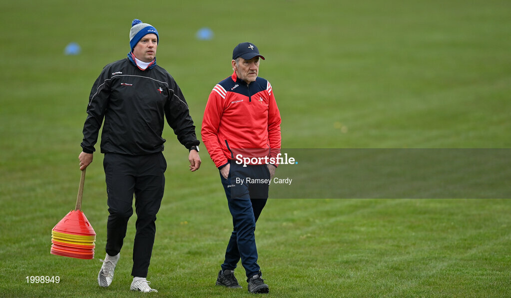 19 April 2021; Assistant manager Gavin Devlin, left, and manager Mickey Harte during Louth senior football squad training at the Louth GAA Centre of Excellence in Louth. Following approval from the GAA and the Irish Government, the GAA released its safe return to play protocols, allowing full contact inter-county training at adult level can re-commence from April 19th. Photo by Ramsey Cardy/Sportsfile