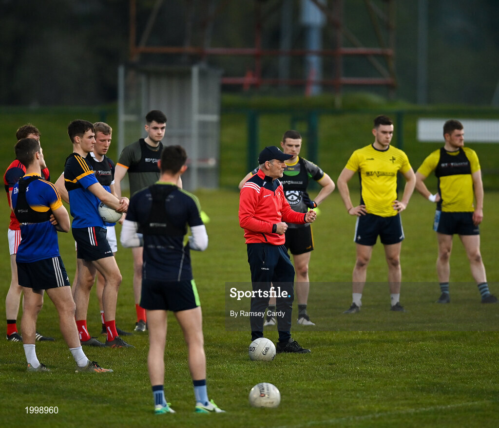 19 April 2021; Manager Mickey Harte speaks to his players during senior football squad training at the Louth GAA Centre of Excellence in Louth. Following approval from the GAA and the Irish Government, the GAA released its safe return to play protocols, allowing full contact inter-county training at adult level can re-commence from April 19th. Photo by Ramsey Cardy/Sportsfile