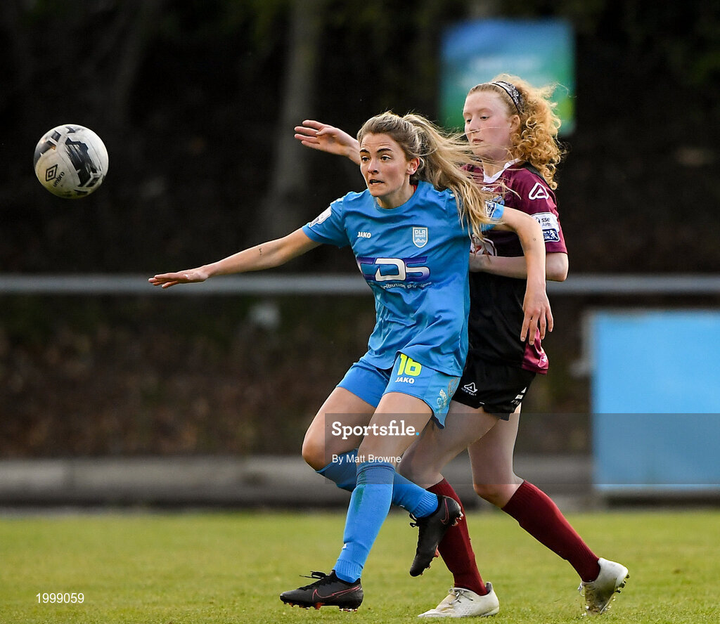 17 April 2021; Avril Brierley of DLR Waves in action against Therese Kinnevey of Galway Women during the SSE Airtricity Women's National League match between DLR Waves and Galway Women at UCD Bowl in Belfield, Dublin. Photo by Matt Browne/Sportsfile