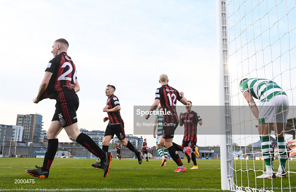 23 April 2021; Ross Tierney, left, of Bohemians celebrates after scoring his side's first goal during the SSE Airtricity League Premier Division match between Shamrock Rovers and Bohemians at Tallaght Stadium in Dublin. Photo by Stephen McCarthy/Sportsfile
