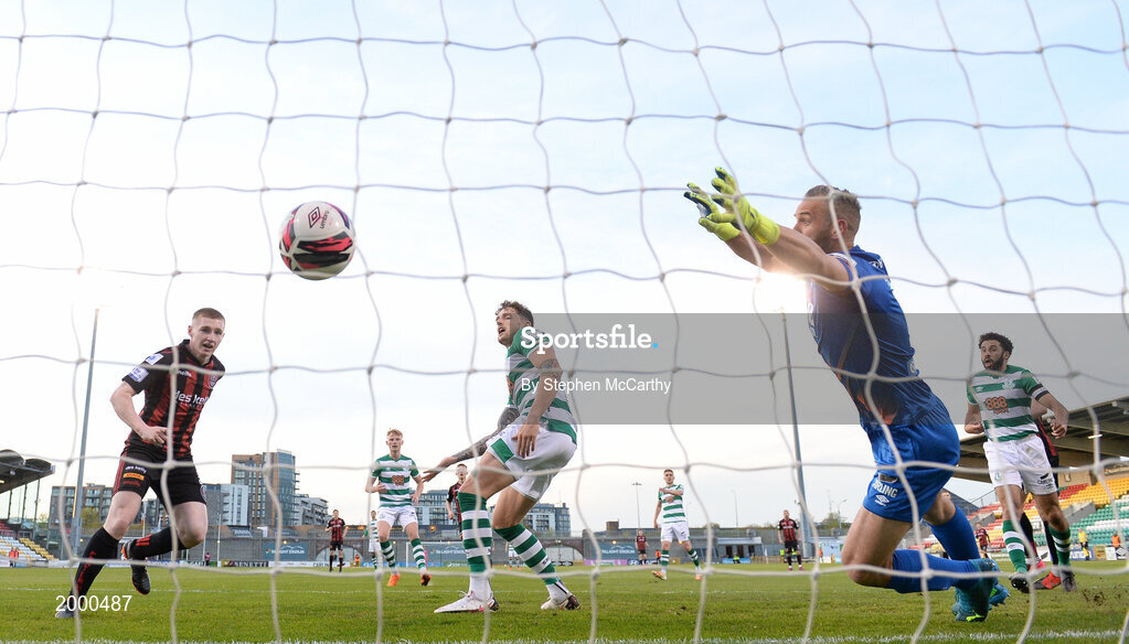 23 April 2021; Ross Tierney of Bohemians heads to score his side's first goal during the SSE Airtricity League Premier Division match between Shamrock Rovers and Bohemians at Tallaght Stadium in Dublin. Photo by Stephen McCarthy/Sportsfile