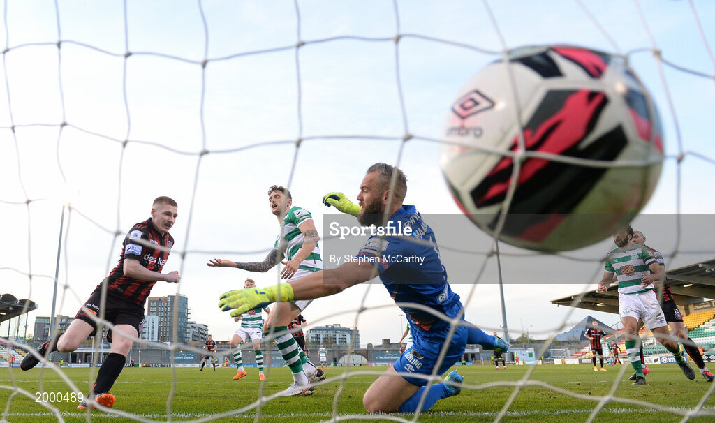 23 April 2021; Ross Tierney of Bohemians heads to score his side's first goal during the SSE Airtricity League Premier Division match between Shamrock Rovers and Bohemians at Tallaght Stadium in Dublin. Photo by Stephen McCarthy/Sportsfile