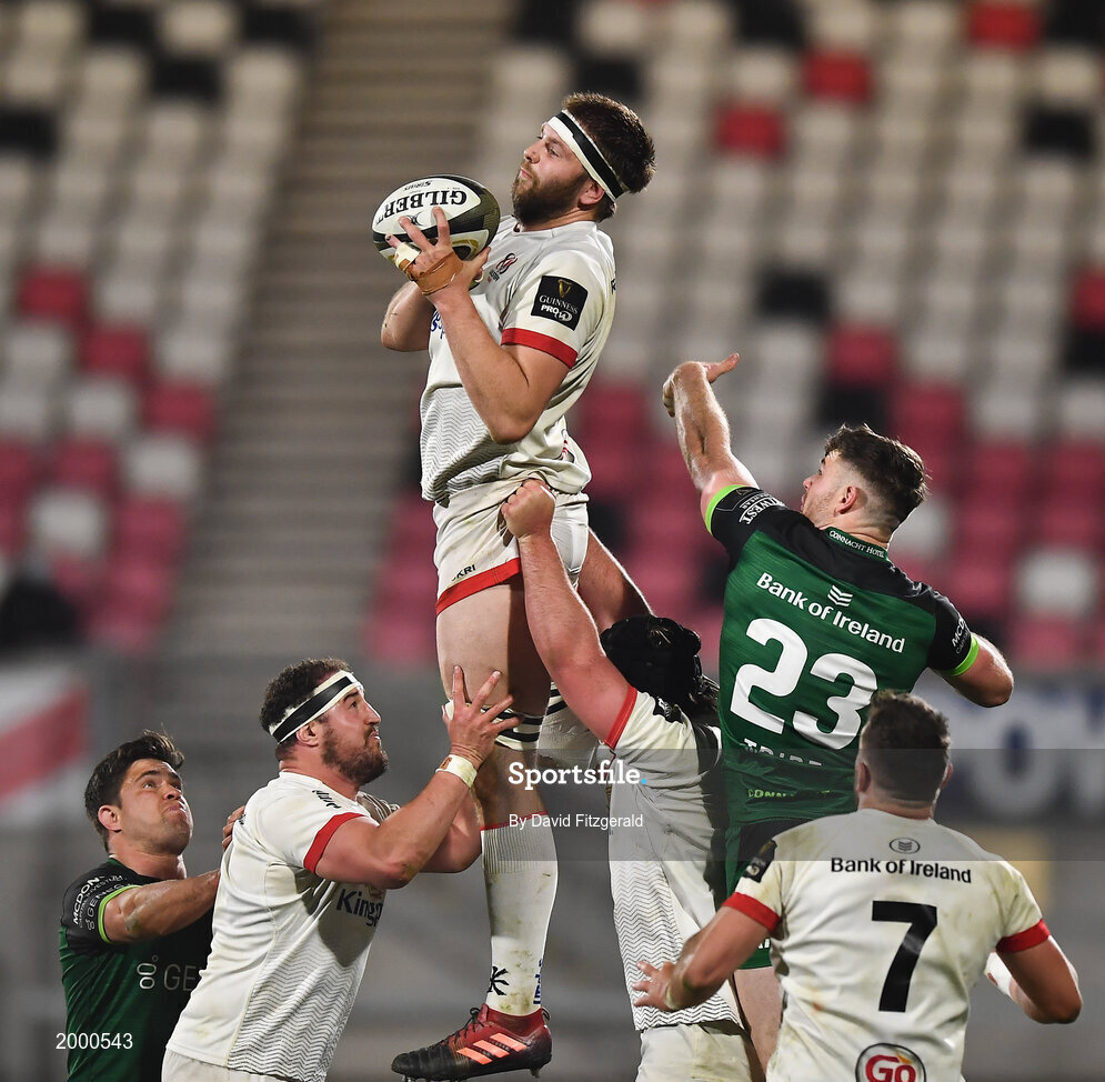 23 April 2021; Iain Henderson, lifted by Ulster teammates Rob Herring, left, and Tom O'Toole, in action against Peter Sullivan of Connacht during the Guinness PRO14 Rainbow Cup match between Ulster and Connacht at the Kingspan Stadium in Belfast. Photo by David Fitzgerald/Sportsfile
