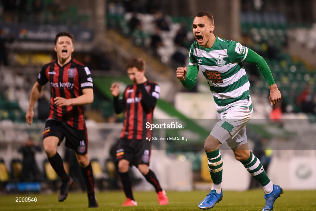 23 April 2021; Graham Burke of Shamrock Rovers celebrates after scoring his side's second goal, a penalty, during the SSE Airtricity League Premier Division match between Shamrock Rovers and Bohemians at Tallaght Stadium in Dublin. Photo by Stephen McCarthy/Sportsfile