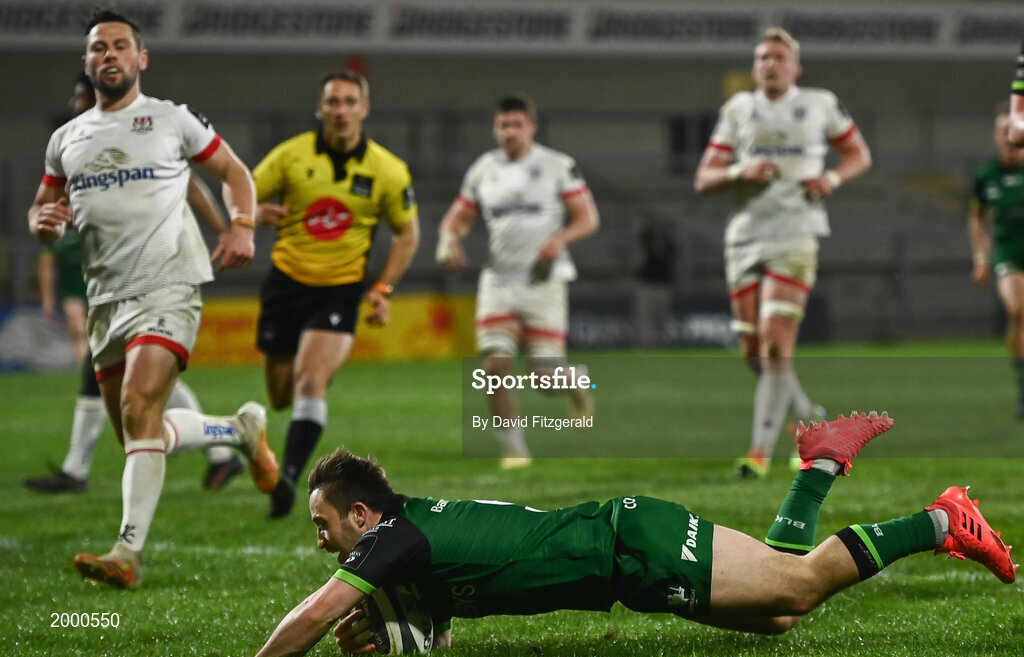 23 April 2021; Caolin Blade of Connacht dives over to score his side's second try during the Guinness PRO14 Rainbow Cup match between Ulster and Connacht at the Kingspan Stadium in Belfast. Photo by David Fitzgerald/Sportsfile