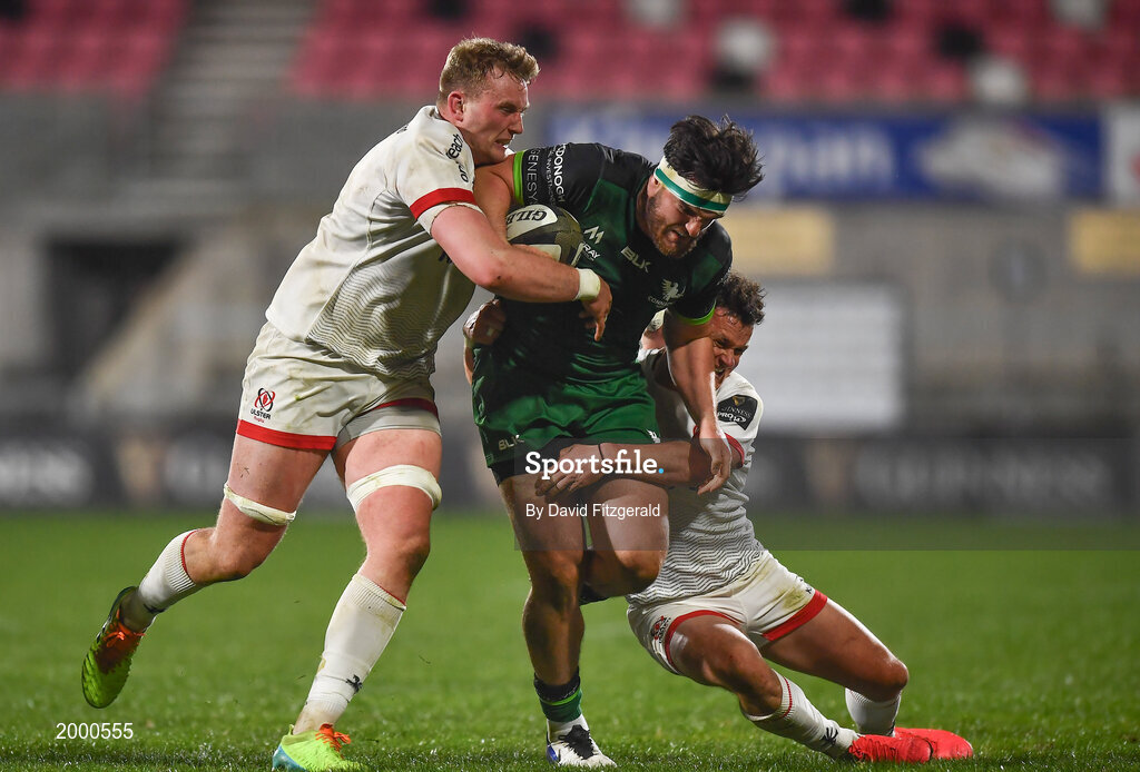 23 April 2021; Tom Daly of Connacht is tackled by Kieran Treadwell, left, and Billy Burns of Ulster during the Guinness PRO14 Rainbow Cup match between Ulster and Connacht at the Kingspan Stadium in Belfast. Photo by David Fitzgerald/Sportsfile