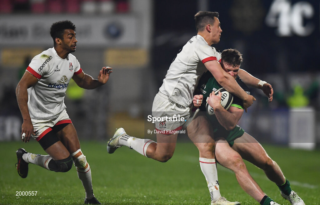 23 April 2021; Peter Sullivan of Connacht is tackled by James Hume of Ulster during the Guinness PRO14 Rainbow Cup match between Ulster and Connacht at the Kingspan Stadium in Belfast. Photo by David Fitzgerald/Sportsfile