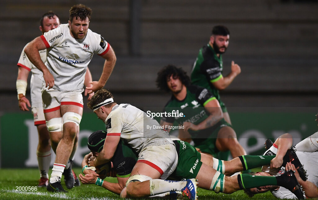 23 April 2021; Ultan Dillane of Connacht dives short of the try line, under pressure from Matty Rea, left, and Ross Kane of Ulster during the Guinness PRO14 Rainbow Cup match between Ulster and Connacht at the Kingspan Stadium in Belfast. Photo by David Fitzgerald/Sportsfile
