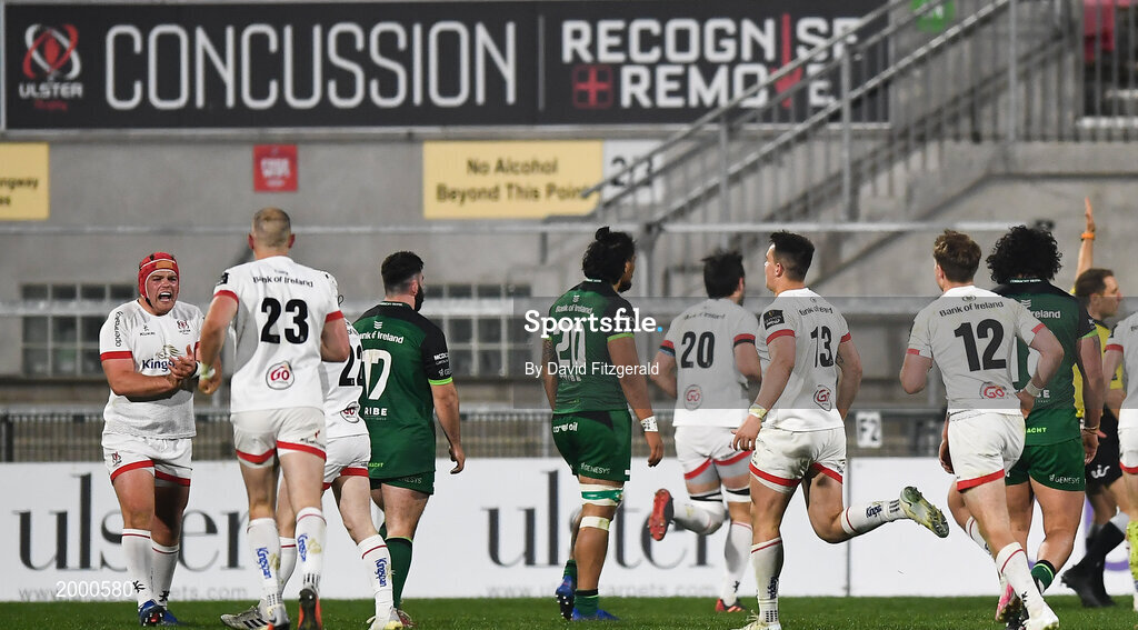 23 April 2021; Ulster players celebrate their side's third try during the Guinness PRO14 Rainbow Cup match between Ulster and Connacht at the Kingspan Stadium in Belfast. Photo by David Fitzgerald/Sportsfile