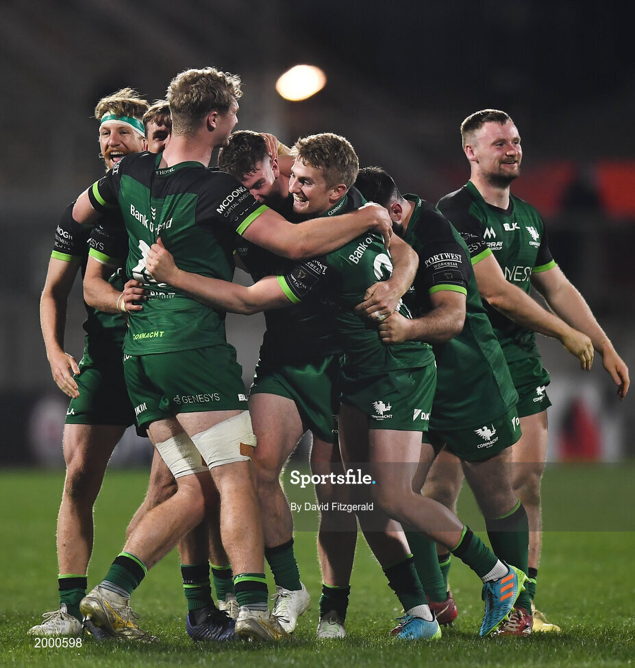 23 April 2021; Connacht players celebrate their side's victory in the Guinness PRO14 Rainbow Cup match between Ulster and Connacht at the Kingspan Stadium in Belfast. Photo by David Fitzgerald/Sportsfile
