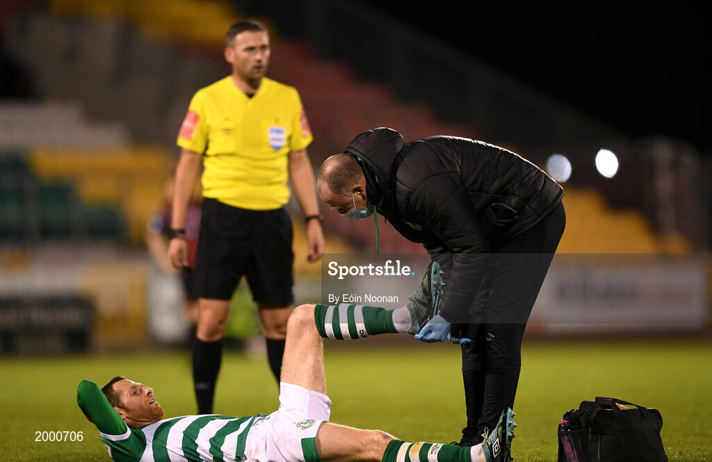 23 April 2021; Chris McCann of Shamrock Rovers receives medical attention for an injury from Shamrock Rovers physiotherapist Tony McCarthy during the SSE Airtricity League Premier Division match between Shamrock Rovers and Bohemians at Tallaght Stadium in Dublin. Photo by Eóin Noonan/Sportsfile