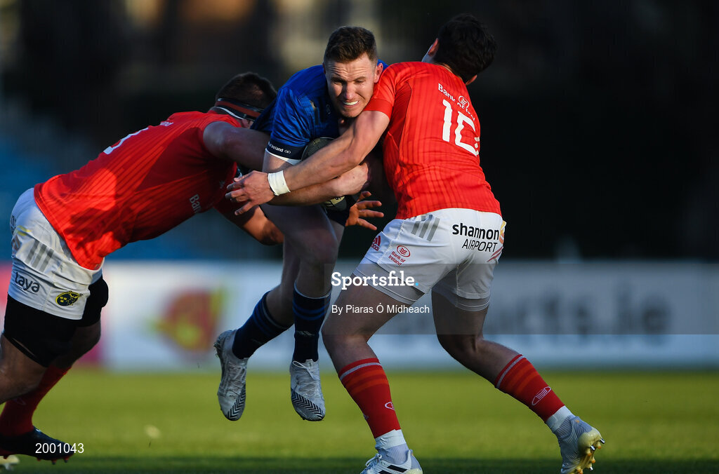 24 April 2021; Rory O'Loughlin of Leinster is tackled by CJ Stander, left, and Joey Carbery of Munster during the Guinness PRO14 Rainbow Cup match between Leinster and Munster at RDS Arena in Dublin. Photo by Piaras Ó Mídheach/Sportsfile