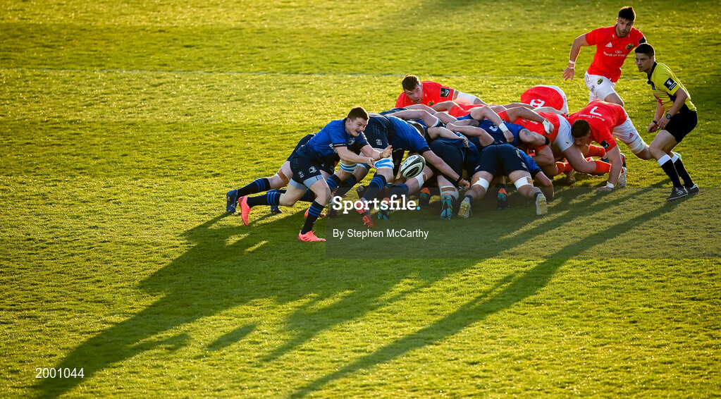 24 April 2021; Hugh O'Sullivan of Leinster passes out the back of a scrum during the Guinness PRO14 Rainbow Cup match between Leinster and Munster at the RDS Arena in Dublin. Photo by Stephen McCarthy/Sportsfile