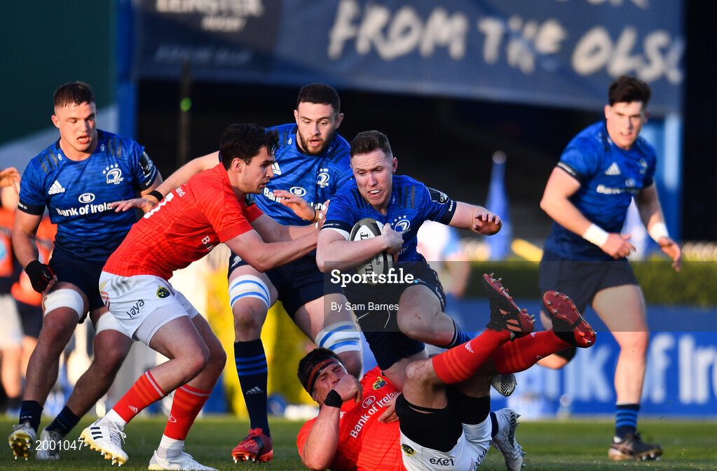 24 April 2021; Rory O'Loughlin of Leinster is tackled by Joey Carbery, left, and CJ Stander of Munster during the Guinness PRO14 Rainbow Cup match between Leinster and Munster at the RDS Arena in Dublin. Photo by Sam Barnes/Sportsfile