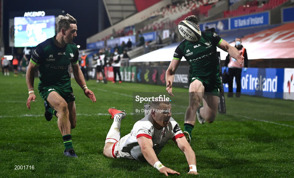 23 April 2021; Will Addison of Ulster fails to gather possession in the lead up to Peter Sullivan of Connacht scoring their side's fourth try during the Guinness PRO14 Rainbow Cup match between Ulster and Connacht at Kingspan Stadium in Belfast. Photo by David Fitzgerald/Sportsfile