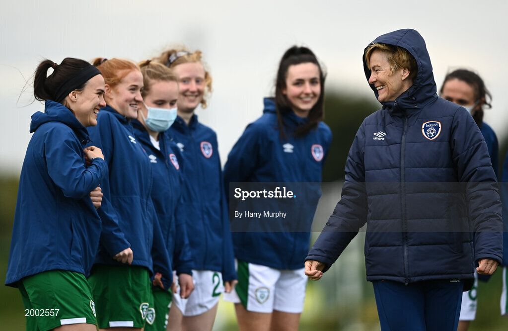 28 April 2021; Manager Vera Pauw meets her players including Ciara Grant, far left, during a Republic of Ireland WNT home-based training session at the FAI National Training Centre in Abbotstown, Dublin. Photo by Harry Murphy/Sportsfile