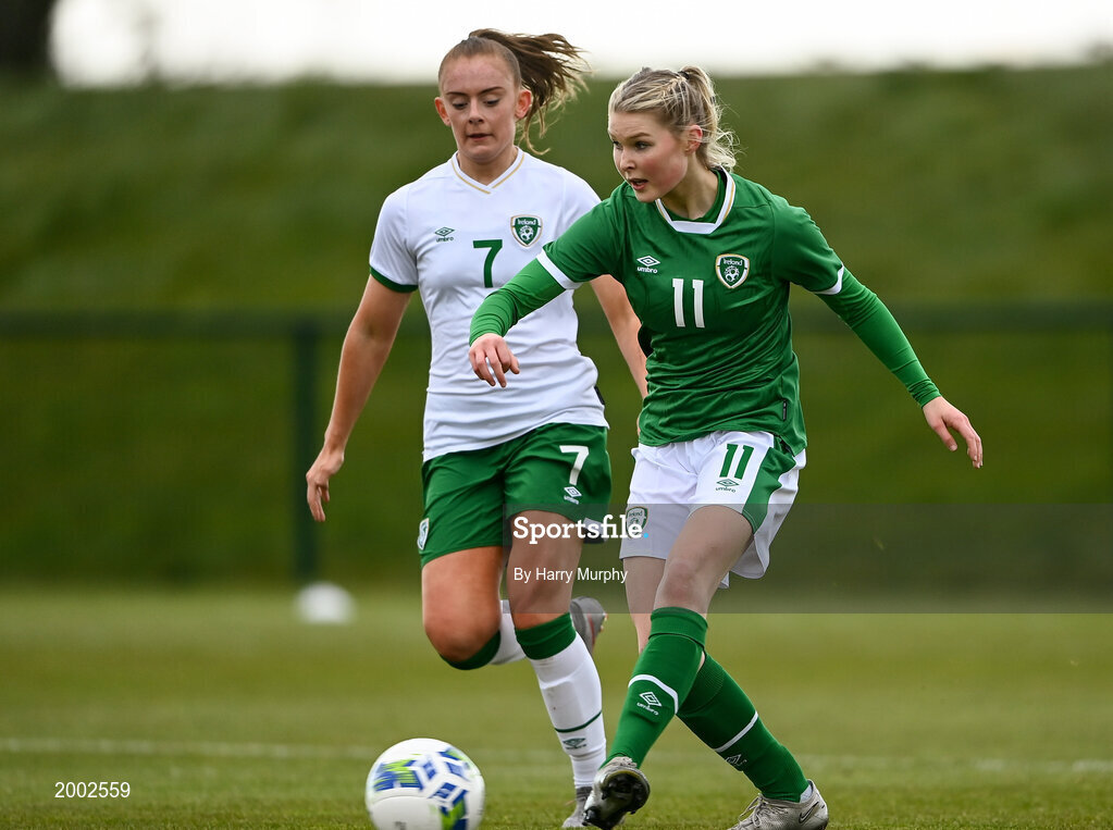 28 April 2021; Eabha O'Mahony in action against Katie Malone during a Republic of Ireland WNT home-based training session at the FAI National Training Centre in Abbotstown, Dublin. Photo by Harry Murphy/Sportsfile