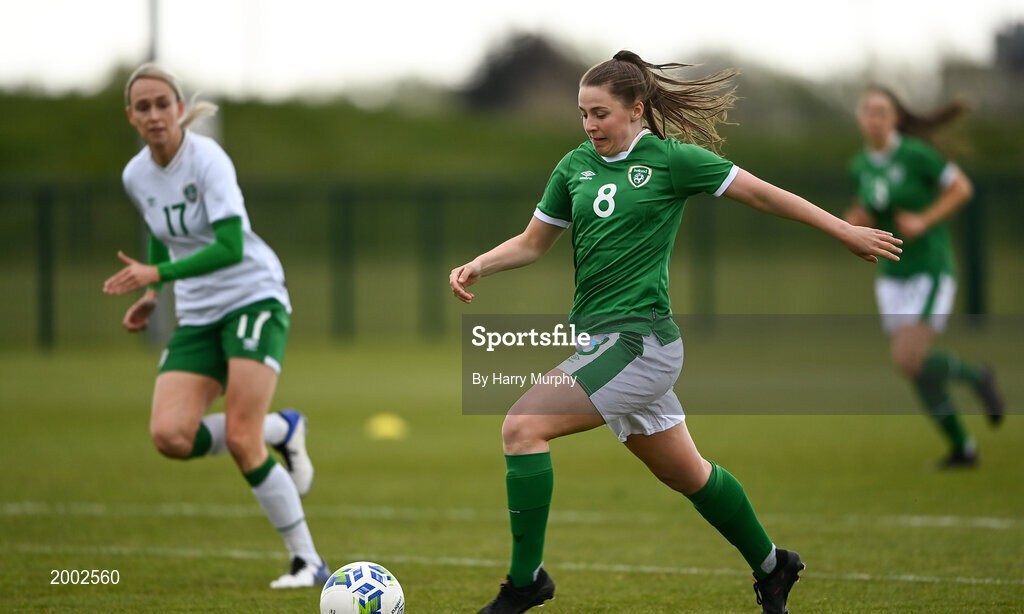 28 April 2021; Eleanor Ryan-Doyle in action against Stephanie Roche during a Republic of Ireland WNT home-based training session at the FAI National Training Centre in Abbotstown, Dublin. Photo by Harry Murphy/Sportsfile