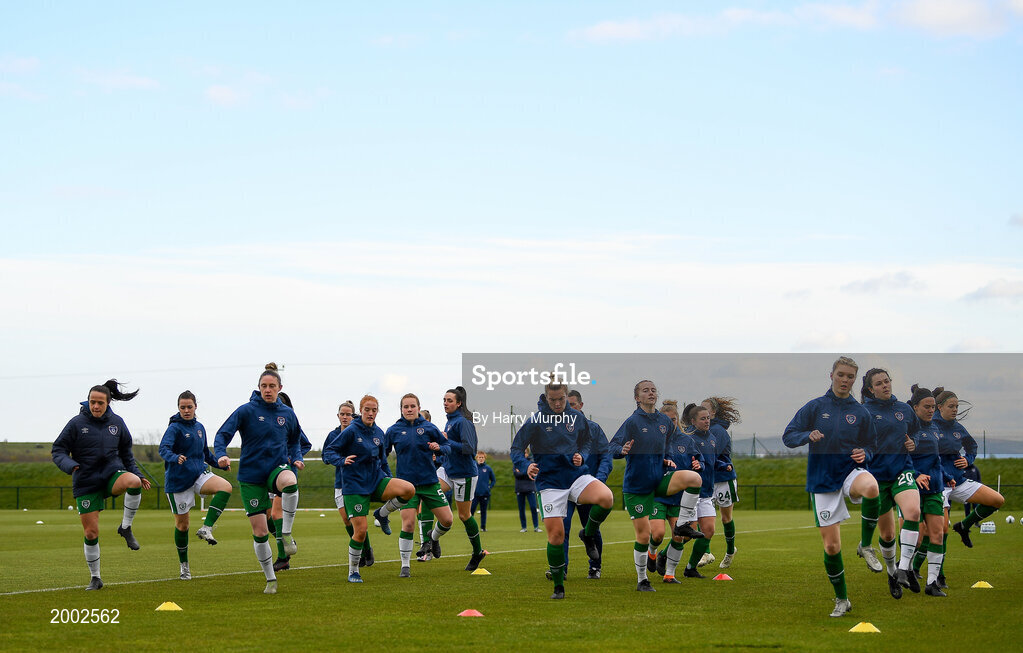 28 April 2021; A general view of the warm-up during a Republic of Ireland WNT home-based training session at the FAI National Training Centre in Abbotstown, Dublin. Photo by Harry Murphy/Sportsfile