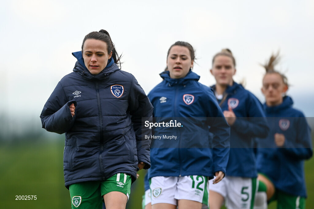 28 April 2021; Aine O'Gorman leads the warm-up during a Republic of Ireland WNT home-based training session at the FAI National Training Centre in Abbotstown, Dublin. Photo by Harry Murphy/Sportsfile