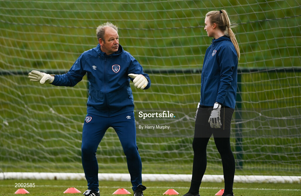 28 April 2021; Goalkeeping coach Jan Willem van Ede speaks with goalkeeper Courtney Maguire during a Republic of Ireland WNT home-based training session at the FAI National Training Centre in Abbotstown, Dublin. Photo by Harry Murphy/Sportsfile