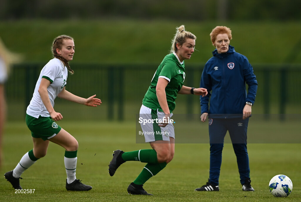28 April 2021; Saoirse Noonan in action against Aoibheann Clancy as assistant coach Eileen Gleeson looks on during a Republic of Ireland WNT home-based training session at the FAI National Training Centre in Abbotstown, Dublin. Photo by Harry Murphy/Sportsfile