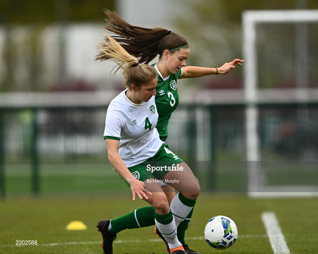 28 April 2021; Ellen Molloy, left, in action against Rebecca Watkins during a Republic of Ireland WNT home-based training session at the FAI National Training Centre in Abbotstown, Dublin. Photo by Harry Murphy/Sportsfile