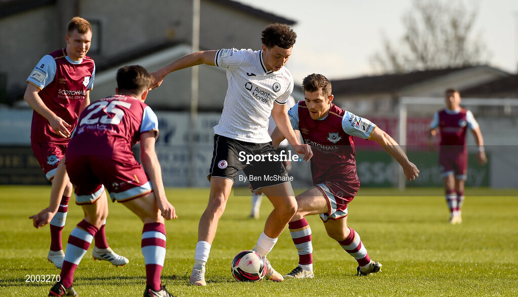 30 April 2021; Jordan Gibson of Sligo Rovers in action against Ryan O'Shea and Ronan Murray of Drogheda United during the SSE Airtricity League Premier Division match between Drogheda United and Sligo Rovers at Head in the Game Park in Drogheda, Louth. Photo by Ben McShane/Sportsfile