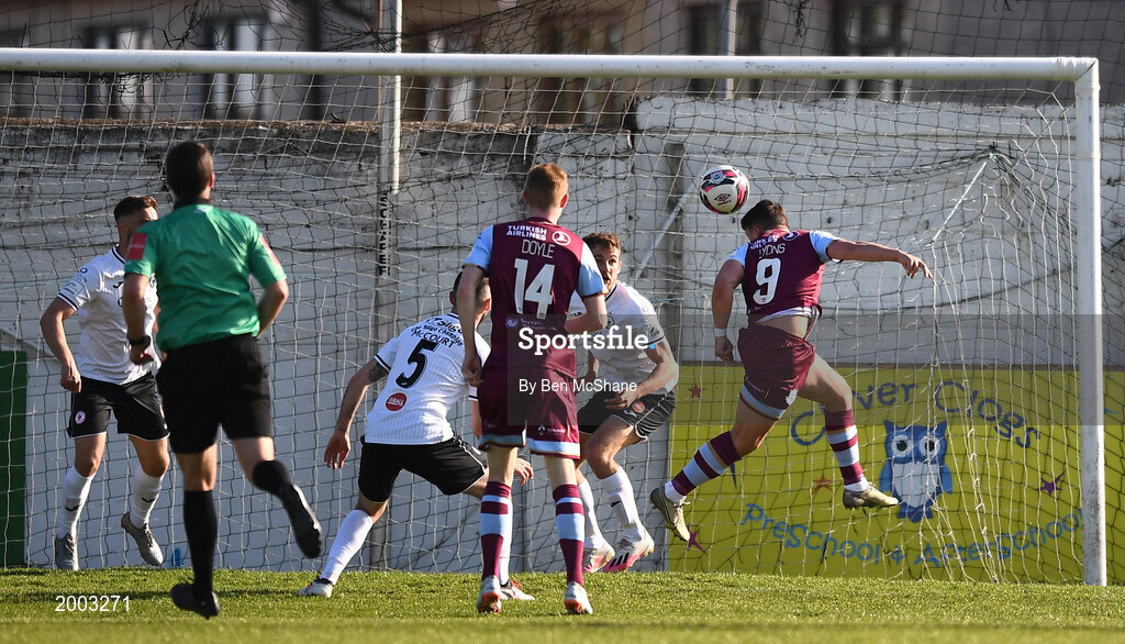30 April 2021; Chris Lyons of Drogheda United heads his side's first goal during the SSE Airtricity League Premier Division match between Drogheda United and Sligo Rovers at Head in the Game Park in Drogheda, Louth. Photo by Ben McShane/Sportsfile