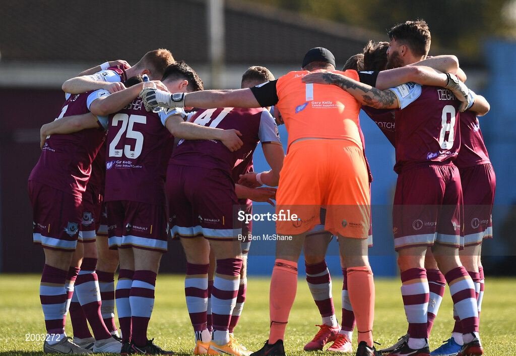 30 April 2021; The Drogheda United team huddle before the SSE Airtricity League Premier Division match between Drogheda United and Sligo Rovers at Head in the Game Park in Drogheda, Louth. Photo by Ben McShane/Sportsfile