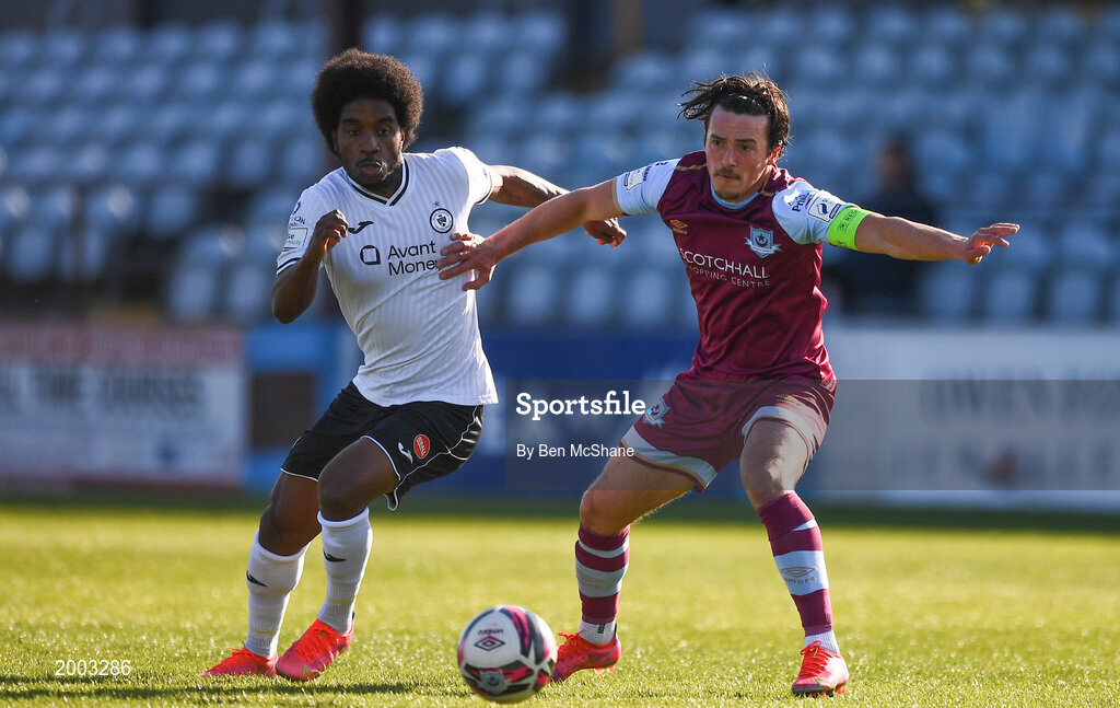 30 April 2021; Walter Figueira of Sligo Rovers in action against James Brown of Drogheda United during the SSE Airtricity League Premier Division match between Drogheda United and Sligo Rovers at Head in the Game Park in Drogheda, Louth. Photo by Ben McShane/Sportsfile