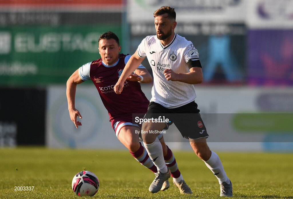 30 April 2021; Greg Bolger of Sligo Rovers in action against Chris Lyons of Drogheda United during the SSE Airtricity League Premier Division match between Drogheda United and Sligo Rovers at Head in the Game Park in Drogheda, Louth. Photo by Ben McShane/Sportsfile