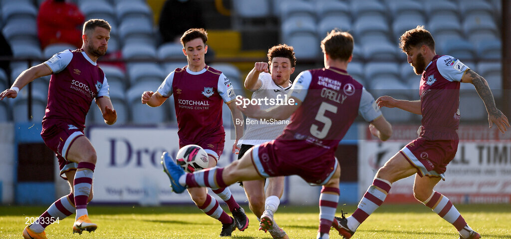 30 April 2021; Jordan Gibson of Sligo Rovers has a shot on goal despite the attendion of Drogheda United players, from left, Dane Massey, Ryan O'Shea, Daniel O'Reilly and Gary Deegan during the SSE Airtricity League Premier Division match between Drogheda United and Sligo Rovers at Head in the Game Park in Drogheda, Louth. Photo by Ben McShane/Sportsfile