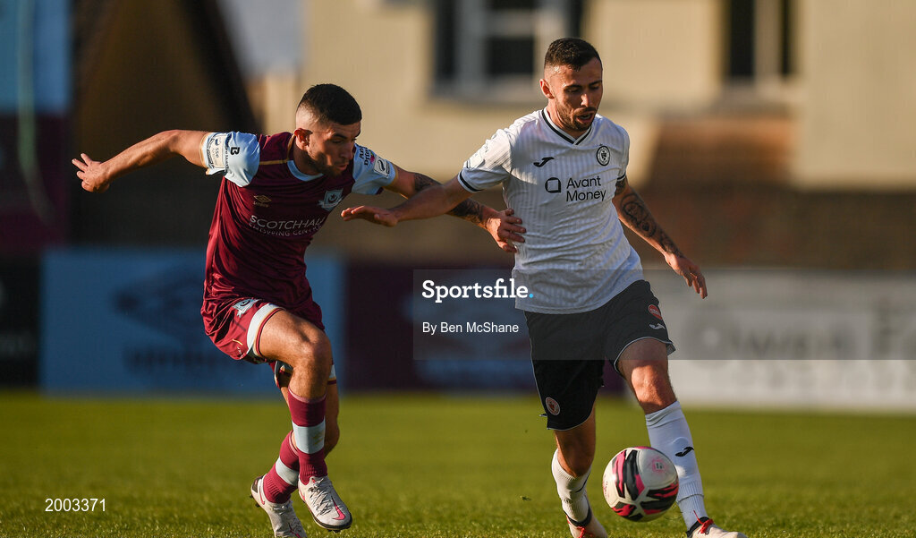 30 April 2021; Robbie McCourt of Sligo Rovers in action against Luke Heeney of Drogheda United during the SSE Airtricity League Premier Division match between Drogheda United and Sligo Rovers at Head in the Game Park in Drogheda, Louth. Photo by Ben McShane/Sportsfile