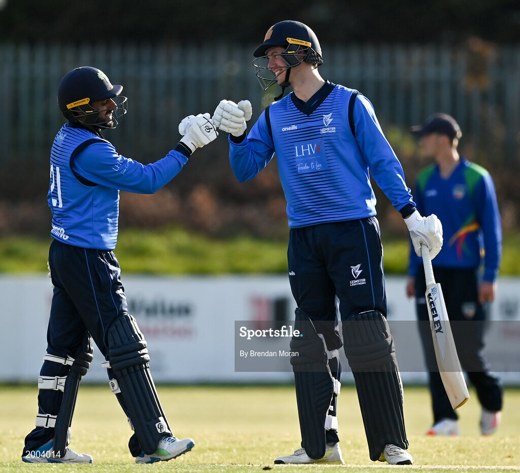 1 May 2021; Simi Singh of Leinster Lightning, left, is congrautlated by team-mate George Dockrell, after hitting the winning runs during the Inter-Provincial Cup 2021 match between Leinster Lightning and North West Warriors at Pembroke Cricket Club in Dublin. Photo by Brendan Moran/Sportsfile