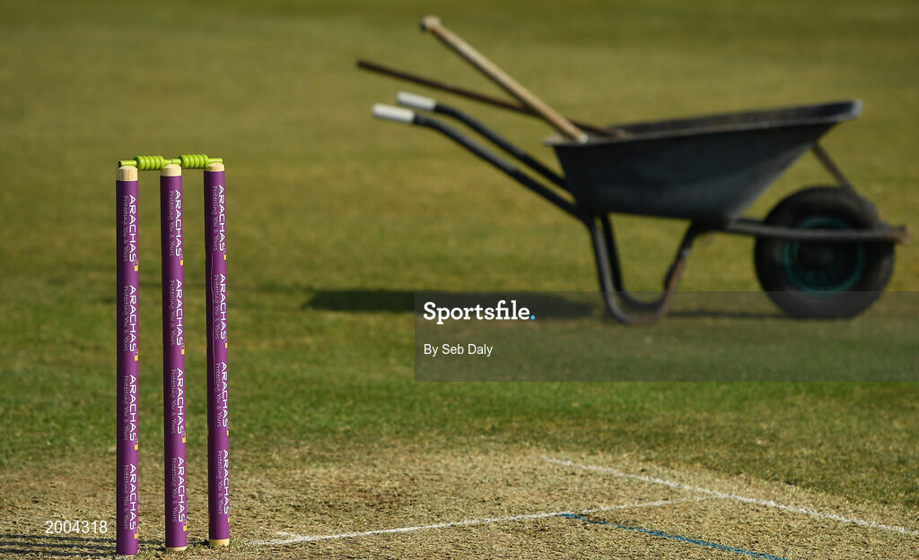 2 May 2021; A detailed view of branded stumps before the Arachas Super 50 Cup 2021 match between Typhoons and Scorchers at Pembroke Cricket Club in Dublin. Photo by Seb Daly/Sportsfile