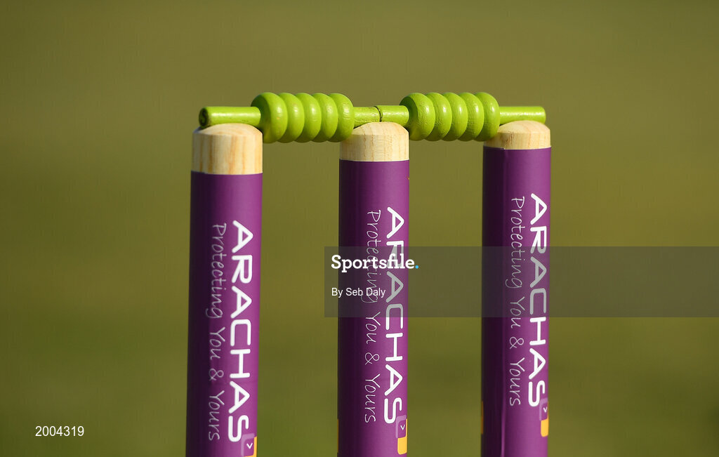 2 May 2021; A detailed view of branded stumps before the Arachas Super 50 Cup 2021 match between Typhoons and Scorchers at Pembroke Cricket Club in Dublin. Photo by Seb Daly/Sportsfile