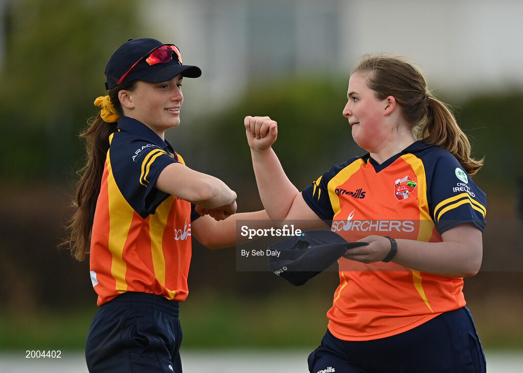 2 May 2021; Lara Maritz, left, and Jenny Sparrow of Scorchers during the Arachas Super 50 Cup 2021 match between Typhoons and Scorchers at Pembroke Cricket Club in Dublin. Photo by Seb Daly/Sportsfile
