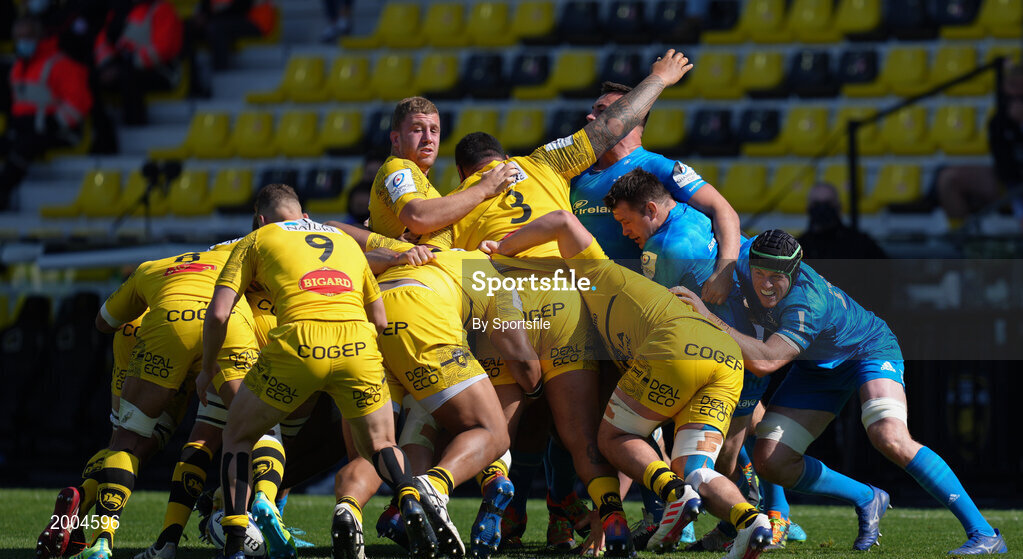 2 May 2021; Leinster players Rónan Kelleher, Cian Healy of Leinster and Ryan Baird during a scrum with the La Rochelle pack during the Heineken Champions Cup semi-final match between La Rochelle and Leinster at Stade Marcel Deflandre in La Rochelle, France. Photo by Julien Poupart/Sportsfile