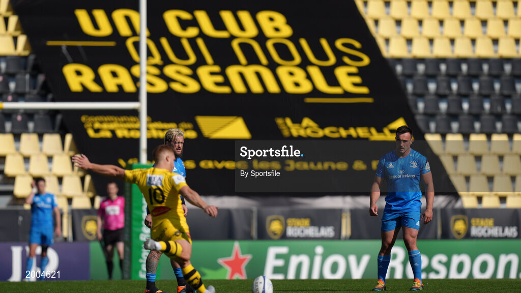 2 May 2021; Andrew Porter, left, and Rónan Kelleher of Leinster watch as Ihaia West of La Rochelle kicks a penalty during the Heineken Champions Cup semi-final match between La Rochelle and Leinster at Stade Marcel Deflandre in La Rochelle, France. Photo by Julien Poupart/Sportsfile